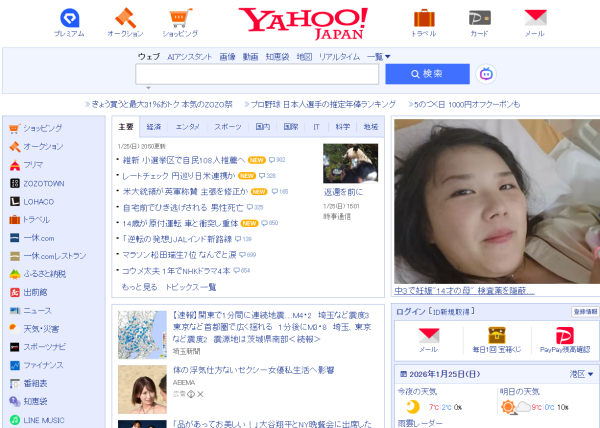 Yahoo! Japan은 웹 검색 기능을 기본으로 제공하면서도, 아래와 같은 다양한 서비스가 통합된 포털입니다: