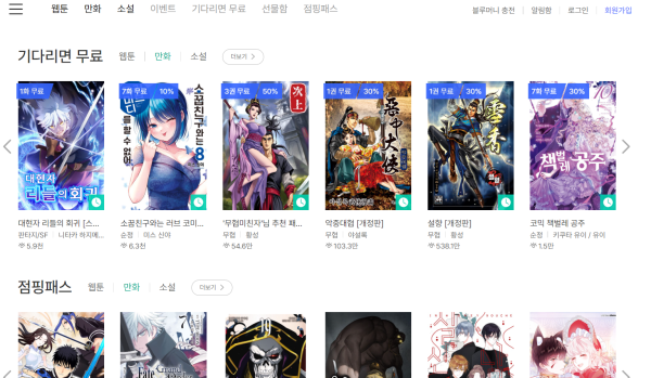 온라인·모바일 모두 지원: 웹(Web) 뿐 아니라 앱에서도 작품을 열람하거나 정액권·쿠폰 등을 통해 유료 콘텐츠를 즐길 수 있습니다.
