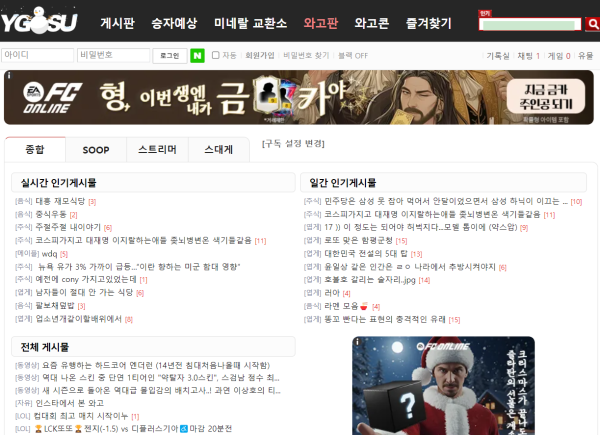 **와이고수(YGOSU)**는 한국에서 잘 알려진 게임·자유 토론 중심의 커뮤니티 사이트입니다.
